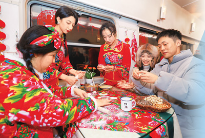 “正月里来是新年,大年初一头一天。”来自北京的旅客马玥跟着列车上的二人转演员一起跳起秧歌,笑得合不拢嘴,“情绪价值拉满了。”在这趟列车上,旅客可以沉浸式体验东北农家的“猫冬”生活——剪窗花、欻嘎拉哈、包饺子、跳东北秧歌……还能穿戴上列车员准备的东北花棉袄、狗皮帽子等特色服饰,玩累了再品尝一下冻柿子、冻梨等东北特色美食。来自天南地北的旅客们围坐在一起,嗑着瓜子,唠着嗑,一起其乐融融看表演。