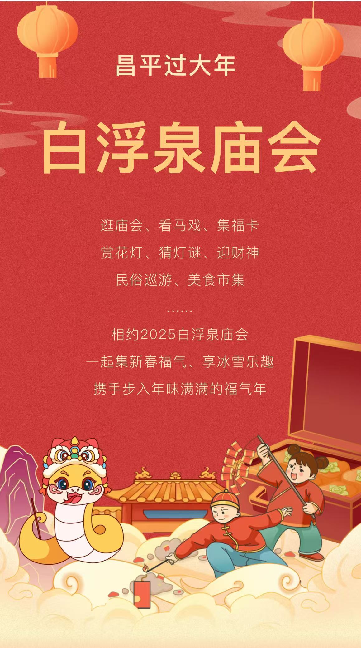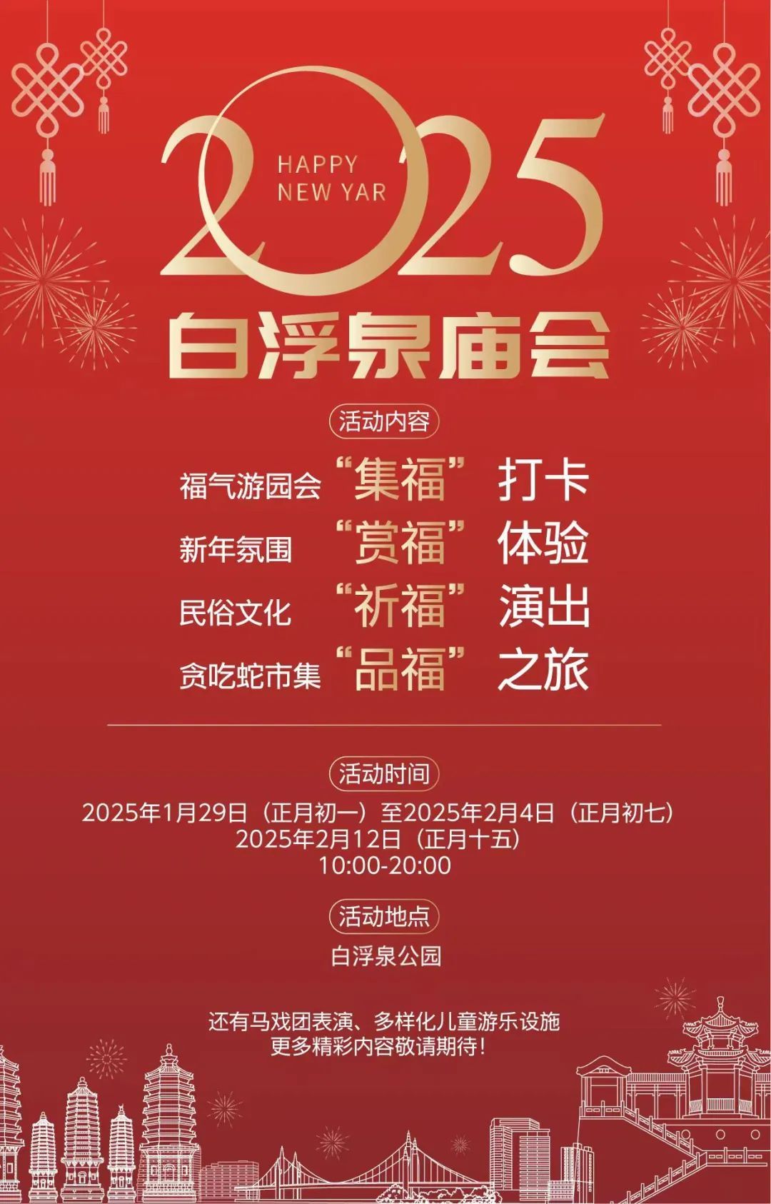 今年庙会,白浮泉公园不仅延续了传统韵味,更融入了现代科技的璀璨光芒。您将有机会亲眼目睹打铁花的古老技艺在夜空中绽放,感受火狐演出的神秘魅力,欣赏非遗盒子灯的独特风采,更有机会目睹飞天龙与凤无人机秀的壮观场景,以及高空飞碟烟火秀、大马戏团带来的震撼体验。小朋友们更是乐不可支,过山车、旋转木马、大滑梯......还有更多儿童游乐设施等待着我们去探索。